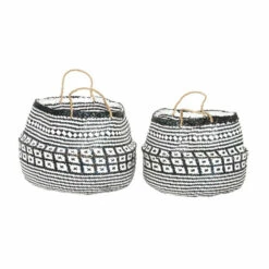Organizing isn’t boring when you have amazing storage baskets to fill. Filled with shoes, books, blankets and more, these storage baskets are a stylish way to store your stuff. Use as boho chic standalone or set of 2 organizer or Decor. This item is shipped in one carton. Due to the handmade nature of this item, no two will be alike, there will be slight differences in shape, size, and color. Suitable for indoor use only. Made in Vietnam. This is a set of 2 nesting storage baskets. Eclectic theme.