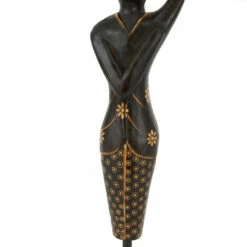 - These wooden people figures showcase a polished and textured black wooden finish with gold paint accents