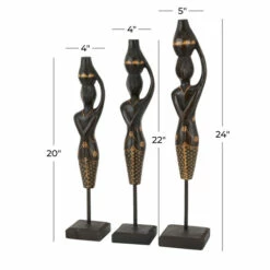 - This black woman sculpture with stand features three abstract-style figures of Ethnic women wearing a knee length robe dress with floral details while gently holding a water pot above their heads