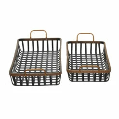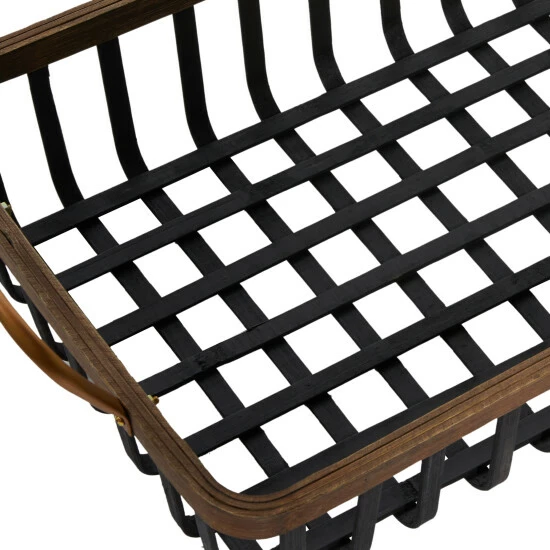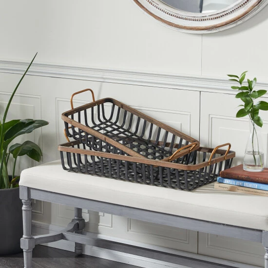 - Each black and brown decorative tray features grid patterned basket details