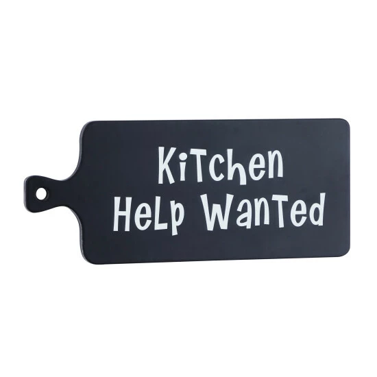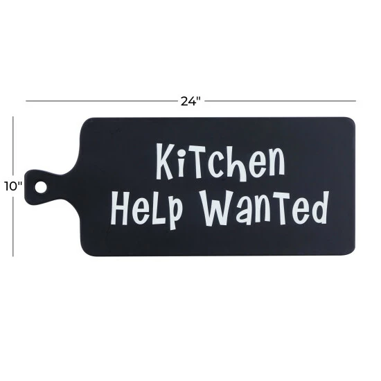 Give your home spaces a sleek and charming vibe with this home decor sign displayed on your living room or bedroom walls. Create an excellent focal point on your walls paired with some cute accent tables, and level up your home with this amazing wall Decor. Place this on any blank wall space adding both texture and depth to your home. This item comes shipped in one carton. Wooden slat is carved as chopping board as frame. Suitable for indoor use only. Modern farmhouse design. Showcases whimsical “Kitchen help wanted” typography. Includes hanging hardware for easy hanging.