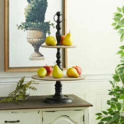 This food-safe two tiered wood stand is a great decorative and serving tray piece for coffee and side tables, the dining area, and the kitchen. Let this tiered server provide a sense of style and function to your home by displaying fruit, napkins, bread, or even corralling clutter. Whether in your kitchen, or on your coffee table, it’s a great way to display and store your favorite things. This item comes shipped in one carton. Sturdy metal finial handle for easy carrying. Suitable for indoor use only. Rustic design.
