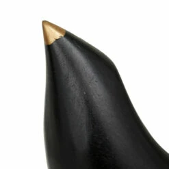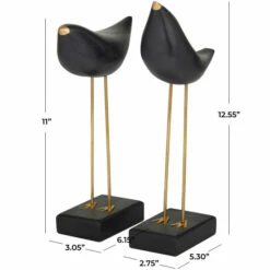 - This set of wood bird sculptures feature a shiny black wooden body with golden legs and beaks