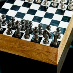 - Silver and chrome black partners with a modern-style polished wooden chessboard