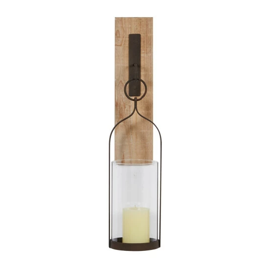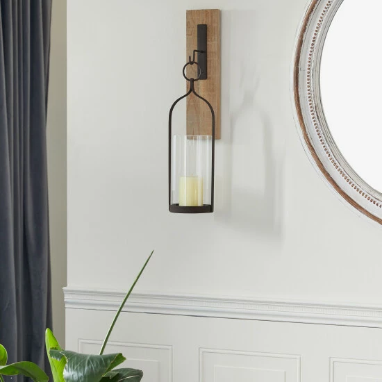 Infuse your space in the romantic candlelight glow that emits from this decorative wall sconce candle holder. This wall sconce for candles is a functional piece that can set a relaxing ambiance in your hallway, living room, bedroom, or kitchen. An accent piece that is not only useful but is also great in creating an elegant appearance to your industrial or farmhouse-themed home. It features hanging glass and metal frame secured to a brown wooden plaque and comes with a sturdy round metal loop for easy and safe hanging. This wall mount candle holder paired with a pillar candle is the perfect combination of a stunning candle arrangement. Made of iron, fir wood, and glass, this home accent portrays beauty and elegance in your interior decoration. This item comes shipped in one carton. Item comes with a sturdy wooden plaque for easy and secure hanging. Suitable for indoor use only. Traditional theme. Wall sconce lantern pillar candle holder can hold one pillar candle.