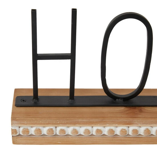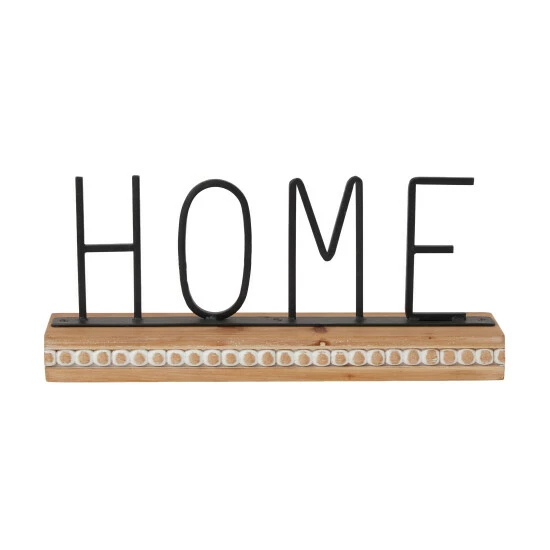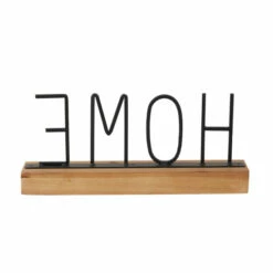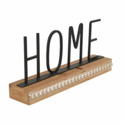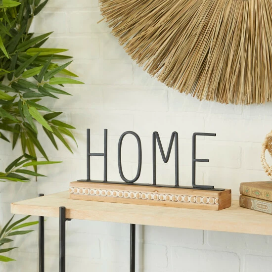 - A decorative accent piece with a black metal βHOMEβ signage supported by a brown rectangular wooden base with beaded design