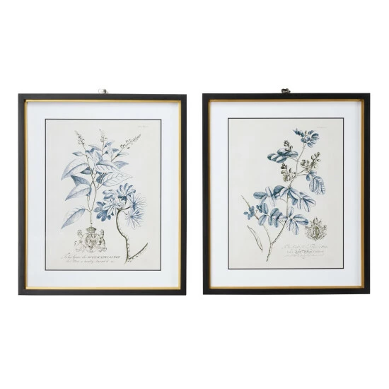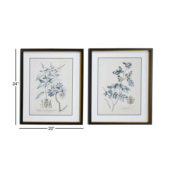 This set of 2 vintage wall decor pieces feature soft dusty blue and muted soft black floral drawings with decorative crests and ornate script housed in black and gold wooden frames. Each vintage-style print is on a soft eggshell-white color paper beneath a white matboard, contrasted against the black frame. The muted blue tones and neutral black of this set of natural wall decor work with almost any color palette and make dimensional focal points in any room. Easy and ready to vertically hang by sawtooth hardware in back. Suitable for indoor use only. This set includes 2 wall art. This item comes shipped in one carton.