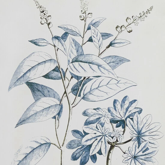 - Pair of vintage-style print framed wall art flower illustrations and crests with Latin and ornate script at the base