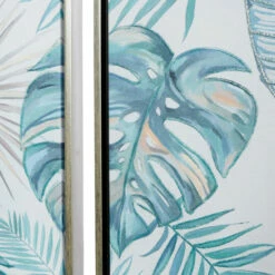 - White canvases lay in the background of large palm fronds, monsteras, and other large leaves painted in light aqua, blue, green, and turquoise with hints of pale pink, all housed in metallic silver frames with black mat boards