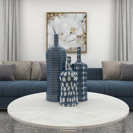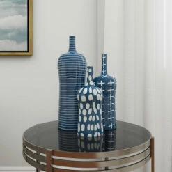 Here is a 3-in-1 set of ceramic vases that you will best appreciate in bohemian-style interiors. It features three different blue and white prints as focal points of design, a glossy finish, and a bottle silhouette. Put flowers in it, or use it as a stand-alone tabletop decoration. It can capture attention on top of wall dressers, on shelves, and next to wall mirrors. Vases stand 19″, 15″, and 12″ and do not have drainage holes.