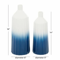 Use as a flower holder on your coffee, console, and kitchen tables, or as a decorative piece on a book shelf or office shelf . Displayed in your dining or living room, entryways or hallways, this vase is sure to bring charm and joy to any space . Display a tall, single stem vase filler in each to draw the eye up and make you space feel taller. Sturdy dolomite construction. Due to the handmade nature of this item, no two will be alike, there will be slight differences in shape, size, and color. This item ships in one carton. Due to the handmade nature of this item, no two will be alike, there will be slight differences in shape, size, and color. Suitable for indoor use only. Each set comes with 2 vases. Tapered neck cylinder vases with narrow rim openings. Coastal design.