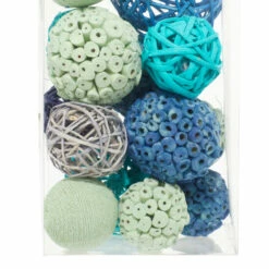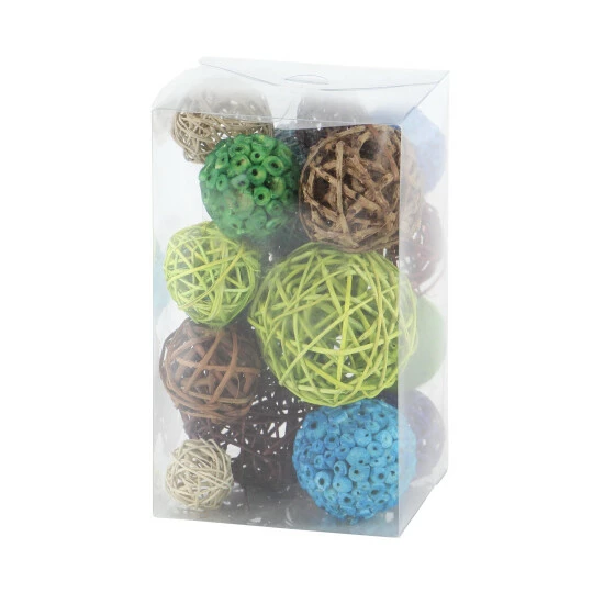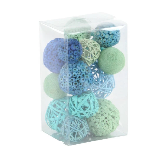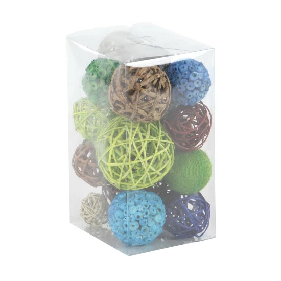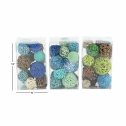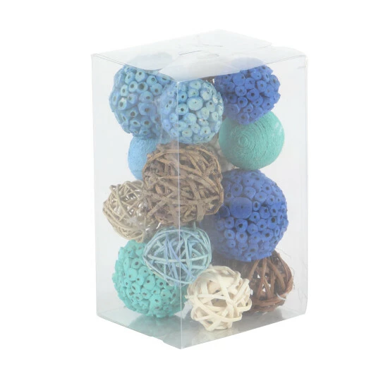 - This eco art deco box comes in a translucent rectangular box container with assorted artistic decorative balls inside made from dried plant fibers in a coastal style inspired look