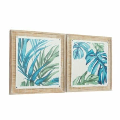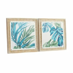 Spruce up your office or living space with this set of 2 wall decor art. The artwork of colorful tropical leaves on canvas is mounted to a high-quality bamboo mat and framed with thick solid natural wood, with hooks mounted on the frame’s back, making it easier to hang. Measuring 29″ in diameter, these solid wood mounted canvas prints are suitable for any tropical and eclectic themed interior. This set of two leaves wall art will surely give color and character to your neutral walls. Suitable for indoor use only. This item comes shipped in one carton.
