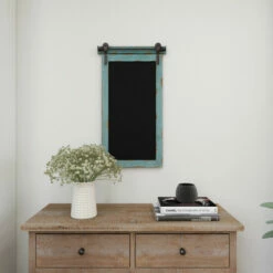 - Chalkboard wall decor highlights cerulean blue frame finish