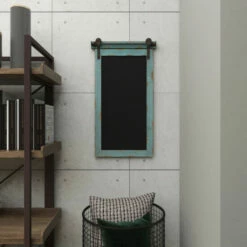 Turn any wall or corner at home into a free-spirited DIY section with this masterpiece-welcoming wall-mounted chalkboard. Its distressed blue wood frame was made specifically for rustic, industrial, and farmhouse homes. An iron bracket backed by plywood at the top section allows it to easily mount on walls. It can also lean on a wooden easel for a more artistic loft-style display concept. This wooden wall decor measures 29″L x 16″W and hangs via two keyholes hardware. Suitable for indoor use only. This item comes shipped in one carton.