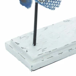 - Set of 2 blue metal fish statues with stands measure 13″L x 3″W x 14″H and 14″L x 3″W x 14″H and collectively weigh 2.5 lbs