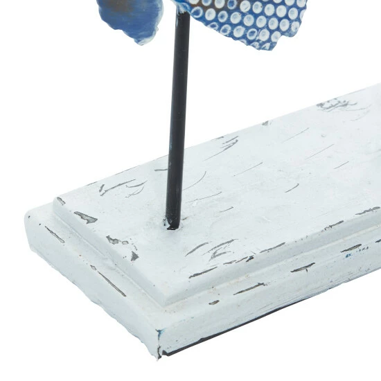 Add whimsy and an artsy feel to your coastal-styled home with this set of 2 gold and blue metal fish table decor sculptures, made from iron and adhered to iron frames. Each carved metal fish features eye, mouth, and fin details, gradient striped gold and blue paint finishes, and carved boho patterns, including hearts, leaves, diamonds, and dots. Each fish is elevated by metal rods connected to each distressed white metal base for prominent display. This set of fish table decor brings a beachy boho feel to your space!. Display together or separately in rooms with a blue background or with abstract coastal paintings to best appreciate the design. Designed with black rubber stoppers at the base that prevent scratching furniture and table tops, as well as sliding around. Wipe clean with a dry cloth. Suitable for indoor use only. This coastal table figurines come as a set of two. Coastal design. This item comes shipped in one carton.