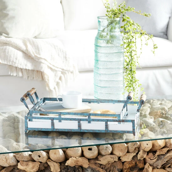 - Constructed with distressed serving trays with open designs and easy-to-use grip handles