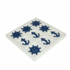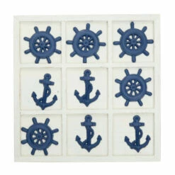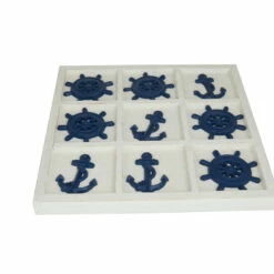 - A decor piece featuring a white square wooden board with 9 slots for unique blue anchor and ship wheel metal game pieces