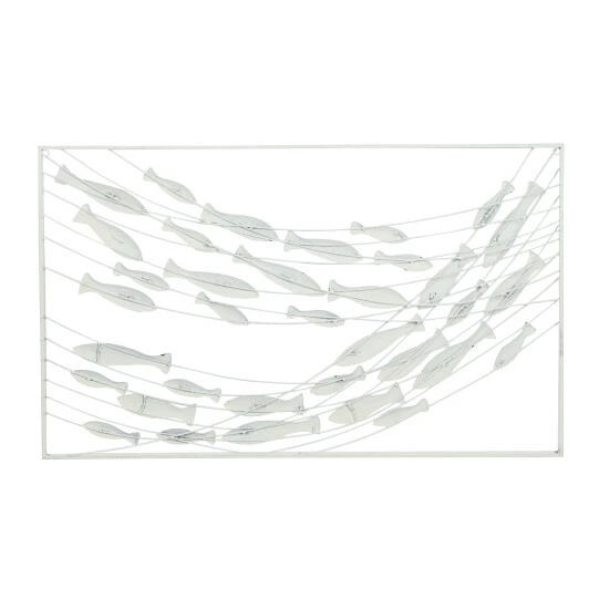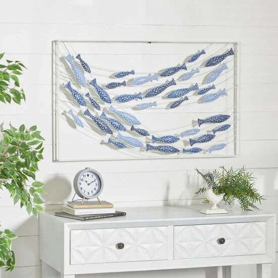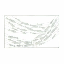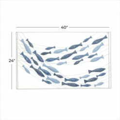 The best way to maximize your wall space and a touch of pizzazz to your home is wall Decor. Appreciate their design best against solid-colored backgrounds in costal settings. They make great unique decor above mantle, console table or in any living space wall. This item comes shipped in one carton. Come with metal loop backing for easy hang. Suitable for indoor use only. Coastal design.. Designed with a coastal inspired theme for a calming and relaxing vibe. Feature fish family wall decor made of a solid metal frame. Features a semi shine finish with shades of blue, white and silver frame. This wall art features a school of fish metal sculpture with white polka dot patterns and blue-toned bodies. Item measures 24.00″ x 40.00″ x 1.63″, and weights 5.00 lbs