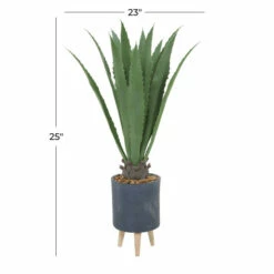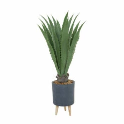 - This bold artificial aloe vera plant showcases a spiky aloe plant design with natural mixed stone fillers and a stylish blue polyethylene pot with chic tripod rubber wood legs