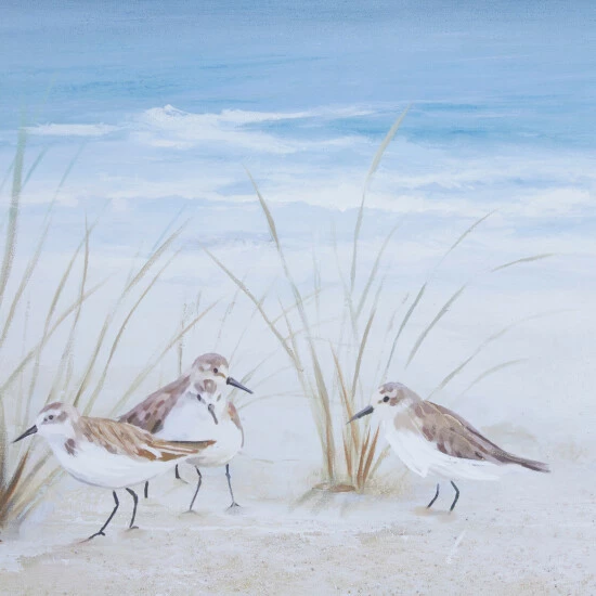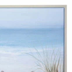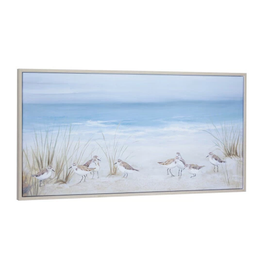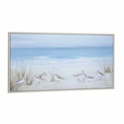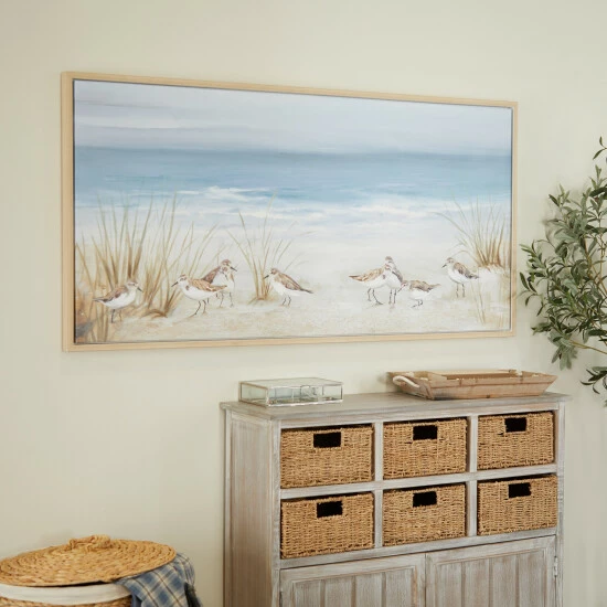 Display this refreshing beach wall art as a focal point canvas for your coastal homes that feature a white toned interior setting with plenty of windows and natural light. Bring a finishing touch to your home with an inviting appeal with this console table. Useful and elegant, console tables are more than just a place to throw your mail. This item is shipped in one carton. Due to the handmade nature of this item, no two will be alike, there will be slight differences in shape, size, and color. This item comes with sawtooth hardware at the back for easy hanging via nail or screw. Suitable for indoor use. Coastal style.. Bring natural warmth to any room with a splash of coastal style. This tan framed canvas wall art features a beach with sand scenery in various color pallets of blue and brown. This calming beach wall art is crafted from polystone, iron, Chinese fir wood, and canvas fabric. This beach scene wall art showcases a morning view with soft ocean waves, a pretty blue skyline, and a flock of sparrow birds walking on sand. This framed canvas art measures 55″W x 27″H