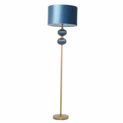 Illuminate your living room or bedroom with this velvet blue floor lamp and add a delicate and refined touch to your home corners. Brighten up any room to create a warming atmosphere for you and your guests with this chic floor lamp. Add height and depth into your open floor space with this expertly designed floor lamp. Designed with black rubber stoppers at theย baseย that prevent scratching as well as sliding around. This item comes shipped in one carton. An assemblage of intricate metalwork forms the column base frame. Suitable for indoor use only. Drum velvet shade encloses the lightbulb of this floor lamp. Comes with an on/off button. Transitional Design.. Transitional is mixture of classic and timeless design for a well established interior design. This home decor is crafted with metal for a solid and durable form. This tall floor lamp highlights blue velvet shade finish with soft sheen and a metallic gold frame finish. Ribbed radial sphere metalwork in velvet blue finish gives drama and adds aesthetics of this floor lamp for a sophisticated elegance. This item measures 18″L x 18″W x 69″H and weighs 13 lbs
