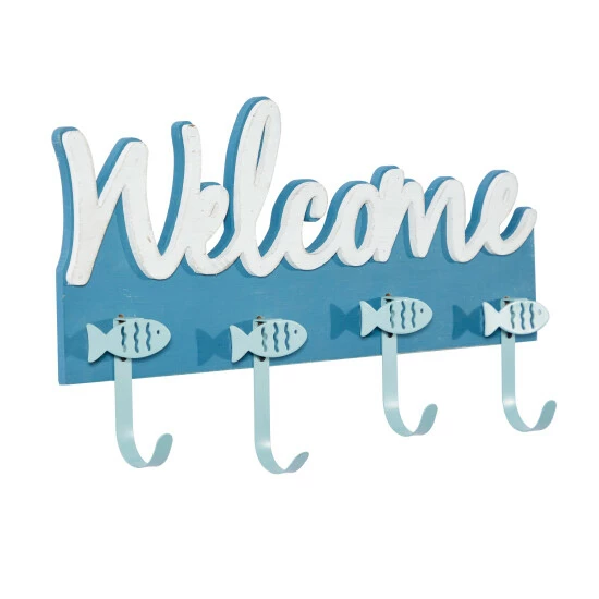 In your entryway, hallway, kitchen or bedroom, add some storage with some style with this wall hook. Great for hanging coats, purses, bookbags, and scarves, this wall hook is as functional as it is stylish. This easily goes with vanilla-painted coastal-themed walls. Wipe clean with a dry cloth. Each hook holds 5 to 8 lbs. Coastal design. It features cursive lettered “WELCOME” sign. Easily hanging using hanging hardware on the back. This item comes shipped in one carton. Each hook holds 5 to 8 lbs.