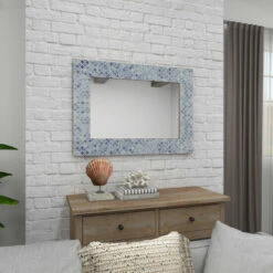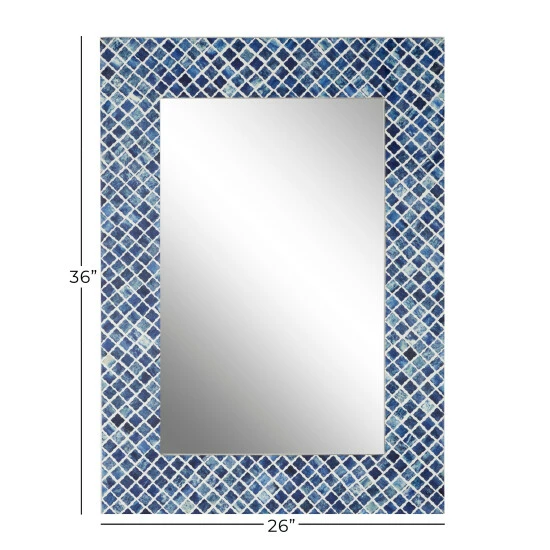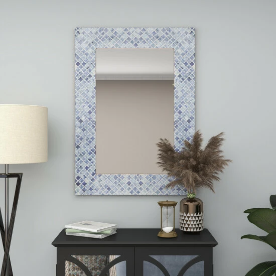 The purpose of a wall mirror, apart from home decoration, is to bounce back outdoor light to a small room to create the illusion of space. Specifically, this rectangular blue-framed mirror complements narrow entryways, small coastal-themed bedrooms, blue-themed hallways, and transitional spaces between rooms. Despite the seemingly heavily tiled frame, lightweight and durable materials were used to create it. This is to maintain an elegant coastal feel on product design. This item can hang vertically or horizontally via keyhole hardware. Suitable for indoor use only. Contemporary theme. This item comes shipped in one carton. Made in India.