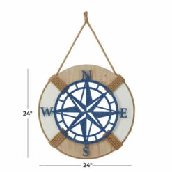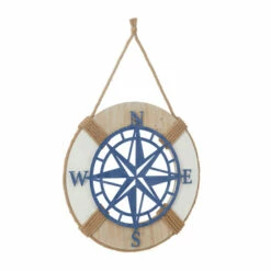 - This accent piece for wall highlights a round lifesaver-inspired design in brown and white finishes with a blue metal compass detail in the middle as well as a brown burlap rope at the top for easy hanging