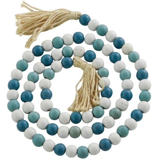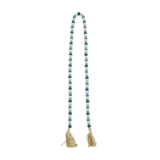 - A beaded garland decoration with blue and white beads and cream cotton tassels