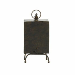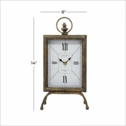 This rectangle distressed brass metal analog clock with hook and stands provides a wall or tabletop option for your eclectic-themed home spaces. Made with a ribbed metal frame, this clock conveniently offers a ring hanging top hook and 4 leg stands with beaded bases. It also flaunts an elegant distressed brass finish and a back battery holder. Hanged on your walls or displayed on your tabletops, this brass-finished analog clock is a perfect addition to your contemporary and traditional home spaces. Requires 1 AA battery, not included. This item comes shipped in 1 carton. Roman numbers are in black, with hash marks, on a white face. The clock mechanism runs silent. Suitable for indoor use only. Displays “Grand Hotel New York City” and “Standard Time 1870” typographies on the clock face. Rustic Design.