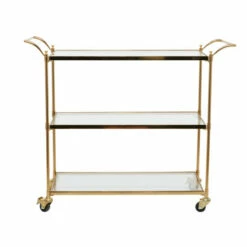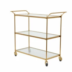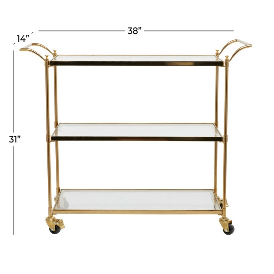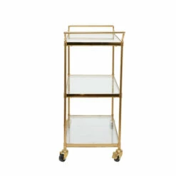 - This 3-tier storage cart accentuates gold-finished frame and transparent glass shelves