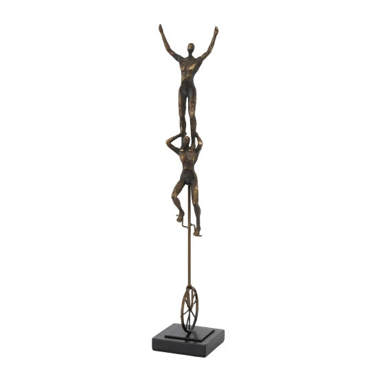 - Sculpted acrobats balancing on a tall unicycle set on a base pedestal
