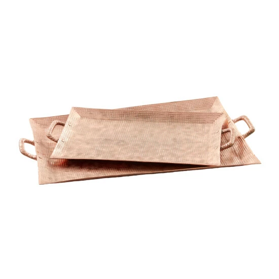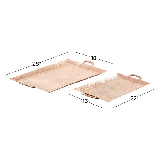 Functional and aesthetically pleasing, this rectangular aluminum decorative tray set is a fabulous accent piece that gives flair to your console table or side table. A storage piece that is spacious for your trinkets or decorative goods on your mantle, coffee table or kitchen counter. Keep your table top protected as you display your memorabilia and belonging on these trays. This item comes shipped in one carton. Please note that this item is for decorative purpose use only and are not food safe. Suitable for indoor use only. Made in India. This set comes with 2 trays. Rustic Setting.