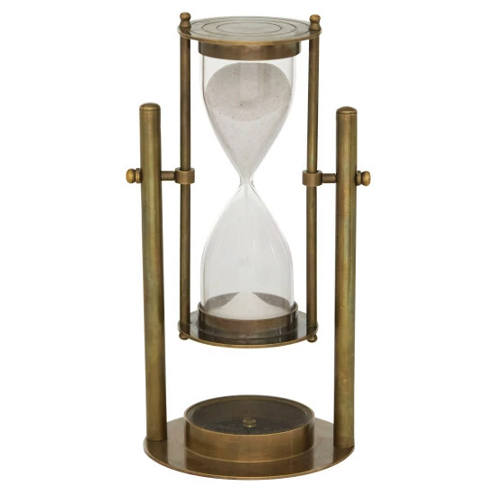 - This interactive brass hourglass timer showcases a rotating hourglass stand feature and a built-in compass design at the bottom of its base