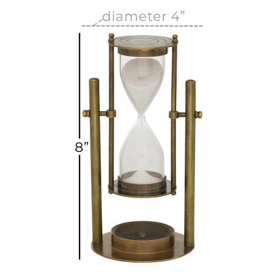 - This unique hourglass timer features a polished bronze metal finish, a clear glass finish, and a white-colored sand timer