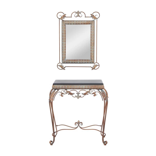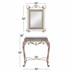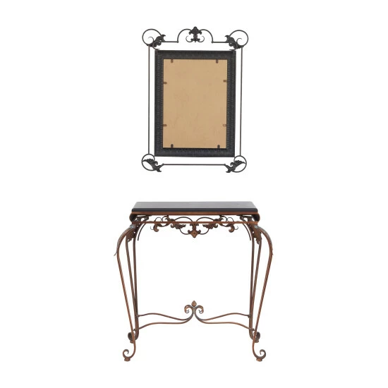 Bring a finishing touch to your home with an inviting appeal with this console table with mirror. Useful and elegant, console tables are more than just a place to throw your mail. Create a ravishing furniture pairing with this console table and wall mirror set design and place them against light-toned backgrounds for a romantic visual delight. Designed with round metal stoppers at the base that prevent scratching furniture and table tops, as well as sliding around. This item ships in 1 carton. This item comes with a metal hardware at the back for easy hanging via nail or screw. Suitable for indoor use only. Maximum weight limit is 100 lbs.. This item comes as a mirror and table set. Traditional style.