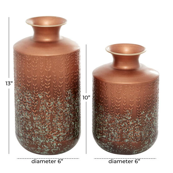 Use as a flower holder on your coffee, console, and kitchen tables, or as a decorative piece on a book shelf or office shelf . Displayed in your dining or living room, entryways or hallways, this vase is sure to bring charm and joy to any space . Display near natural or artificial light to experience the shimmery copper finishes. Lightweight design safe for any tabletop. This item ships in one carton. Suitable for indoor use only. Each set comes with 2 vases. Flared lip table vases with 2″ rim openings each. Farmhouse-themed style.. Designed with a farmhouse style for that homey feeling. Each cylinder vase is constructed from solid iron. Metallic copper finishes with hammered metal stem and leaf designs with textural light green patina effects around each base. Feature rubber stoppers beneath the bases to prevent scuffing and sliding. Pair of copper vases measure 6.3″L x 6.3″W x 12.5″H, 6.3″L x 6.3″W x 10″H and collectively weigh 4 lbs