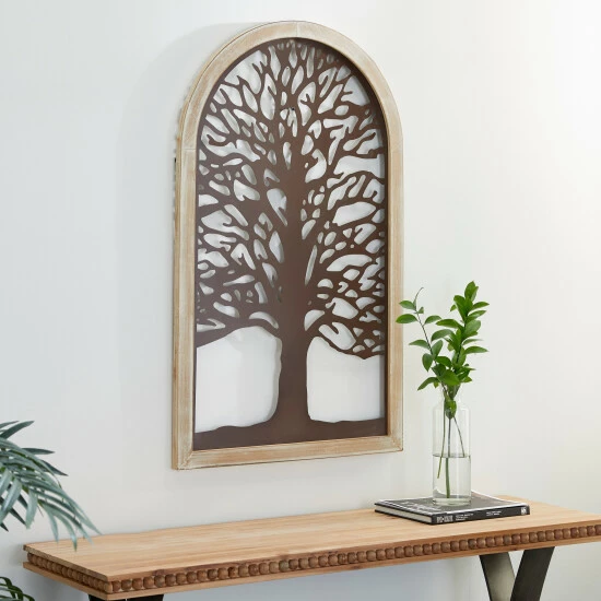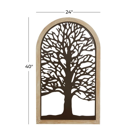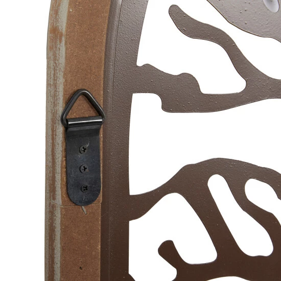 Enjoy nature from the comfort of your living room with this decorative wall arch. The bronze-colored dΓ©cor is a great addition to a rustic- or farmhouse-style room, and it matches well with other natural design elements. The stunning tree silhouette is made of iron, and it’s encased in a gracefully arched wooden frame. Triangle hangers on the back of the frame provide for easy mounting.