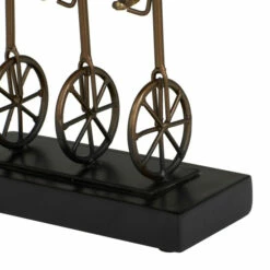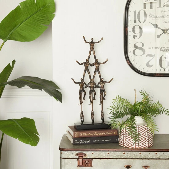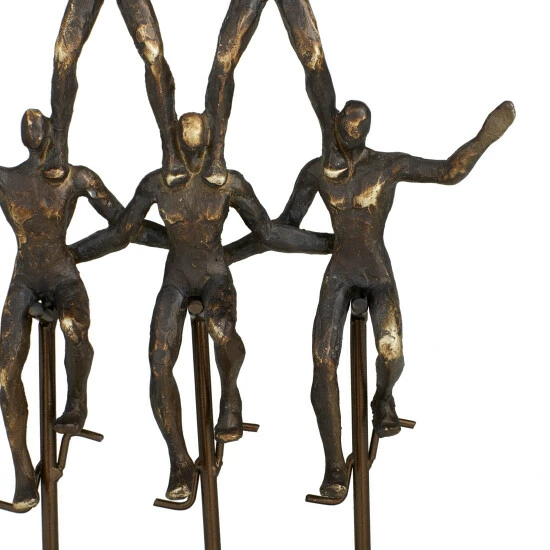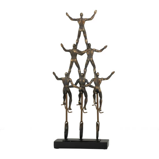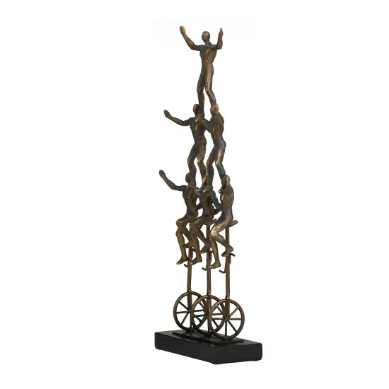 - A polystone decorative sculpture featuring stacked acrobats with unicycles and rectangular base