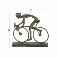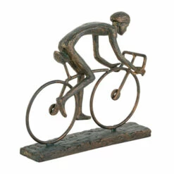 - A slender cyclist sculpture that comes with a distressed bronze finish