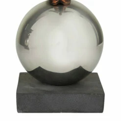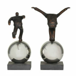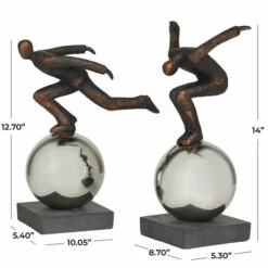 - Set of 2 table sculptures features men walking on top of silver globe balancing on a square base