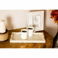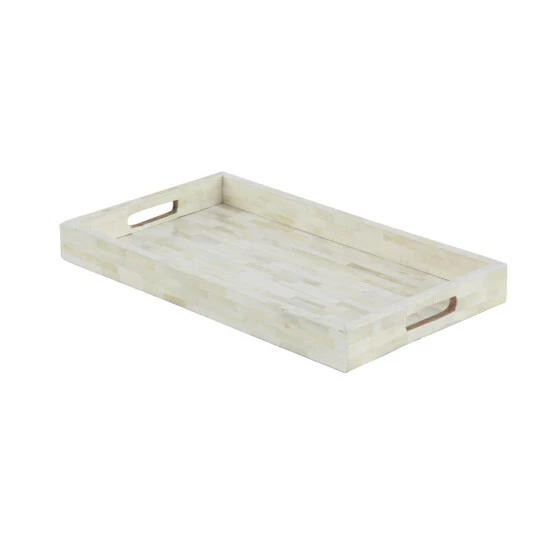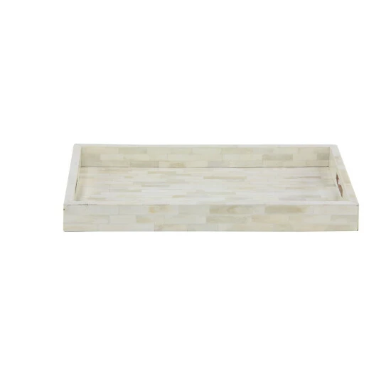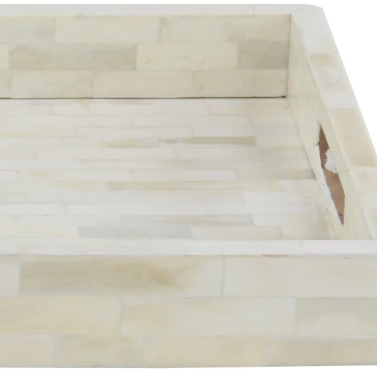 - Each light brown decorative tray features wood and bones polished mosaic for a chic natural look