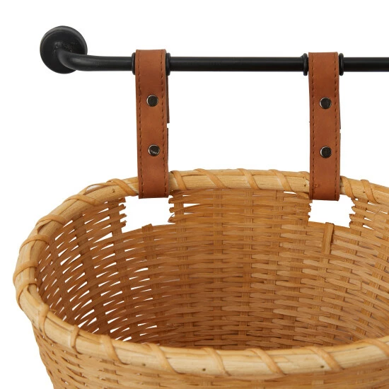 - A medley of natural wood brown basket finish and ebony black rod frame highlight this wall shelf