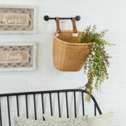 Organize your living room or bedroom with this wall basket shelf for that laid back farmhouse vibe. Utilize your wall space to add more storage for a space saving solution in any compact area. Whether used as a focal point, or to display your favorite things, this wall shelf it the perfect addition to any home. Shipped in one carton. Furnished with back keyhole hooks for easy hanging. Suitable for indoor use only. Comes with 2 bamboo baskets for shelves. Farmhouse design. Holds up to 20 pounds.