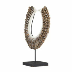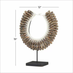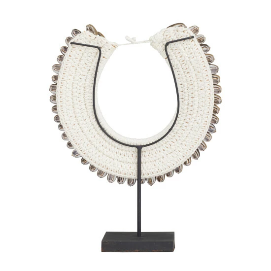 Give your counters, console, and coffee tables a hint of eccentric elegance with this shell necklace sculpture Decor. This sculpture will elevate the look of any stylish home with its dimensions and textural appeal. An artistic display to showcase your personality and enhance the look of any open surface space. This item comes shipped in one carton. Suitable for indoor use only. Made in Indonesia. Eclectic design.