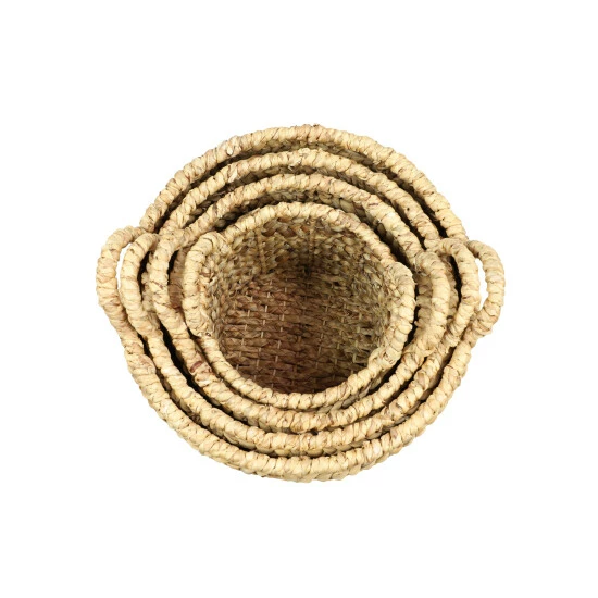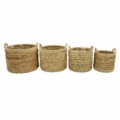 Rolling texture and rich natural tones reign throughout this set of 4 blondish-beige colored, round wicker storage baskets. Each decorative basket is made from water hyacinth, giving them a natural, warm beige hue to accommodate your natural home decor. They make for excellent home storage as linen baskets and are easy to carry with their 2″ tall, half circle, hard handles that reach upward from the top of the basket. These large baskets feature beautifully hand-braided wicker rope cords laid out in horizontal rows and bound by rattan strips. This item comes shipped in one carton. Nesting baskets with ample storage. Suitable for indoor use only. Made in Vietnam. Set of 4 round woven storage baskets. Coastal design.