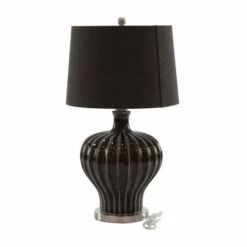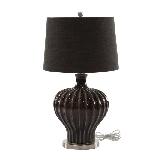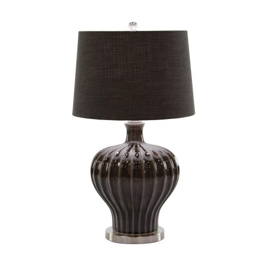 Get this elegant table lamp from Studio 350 for ambient lighting and accent decoration in your living room or bedroom. It features a drum-type linen shade, a round iron finial, a rounded tapered earthenware body adorned with vertical ribbing, and a flat round iron base. Flaunting a sleek dark brown finishing with silver accents, this table lamp perfectly complements modern-themed settings. Place it in light-themed spaces for a welcoming contrast, near sofas or chairs for task lighting, or in room corners for a dramatic and relaxing glow.