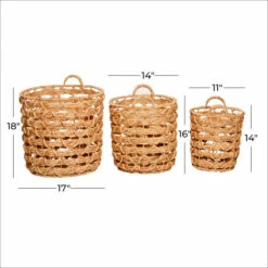 Organizing isn’t boring when you have amazing storage baskets to fill. Filled with shoes, books, blankets and more, these storage baskets are a stylish way to store your stuff. Use as charming and natural standalone or set of 3 organizer or Decor. Wipe clean with a dry cloth. Due to the handmade nature of this item, no two will be alike, there will be slight differences in shape, size, and color. Made in Vietnam. This set contains 3 nesting storage baskets. Coastal design. This item ship in one carton.